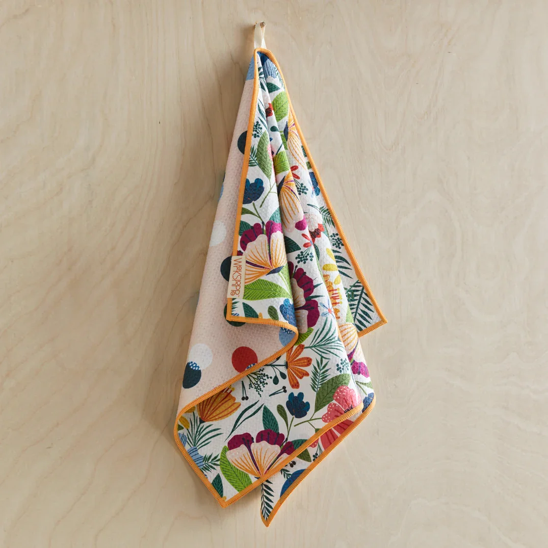 Werkshoppe carries this playful microfiber towel, which features my cottage floral design and gold loopy coordinate on the reverse side.